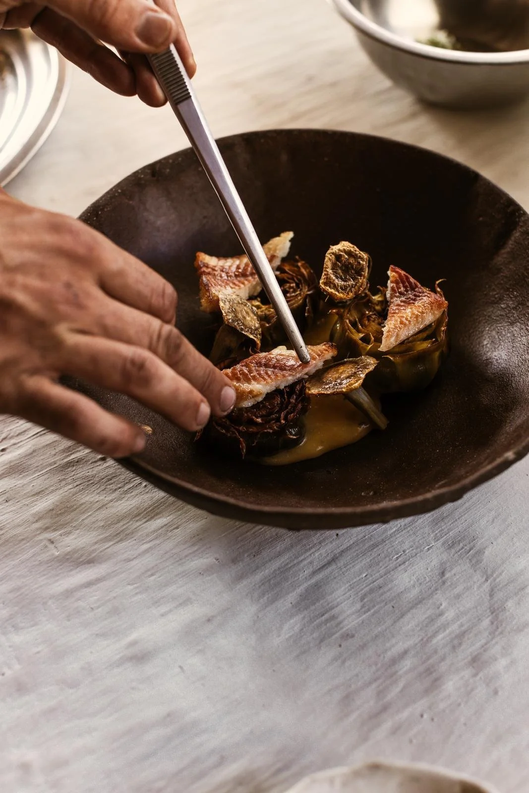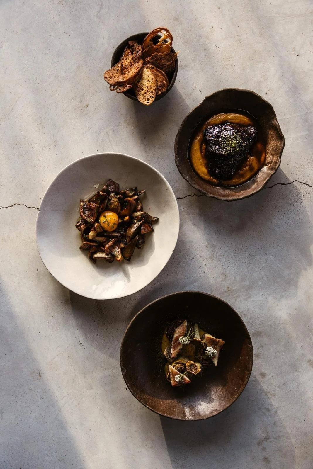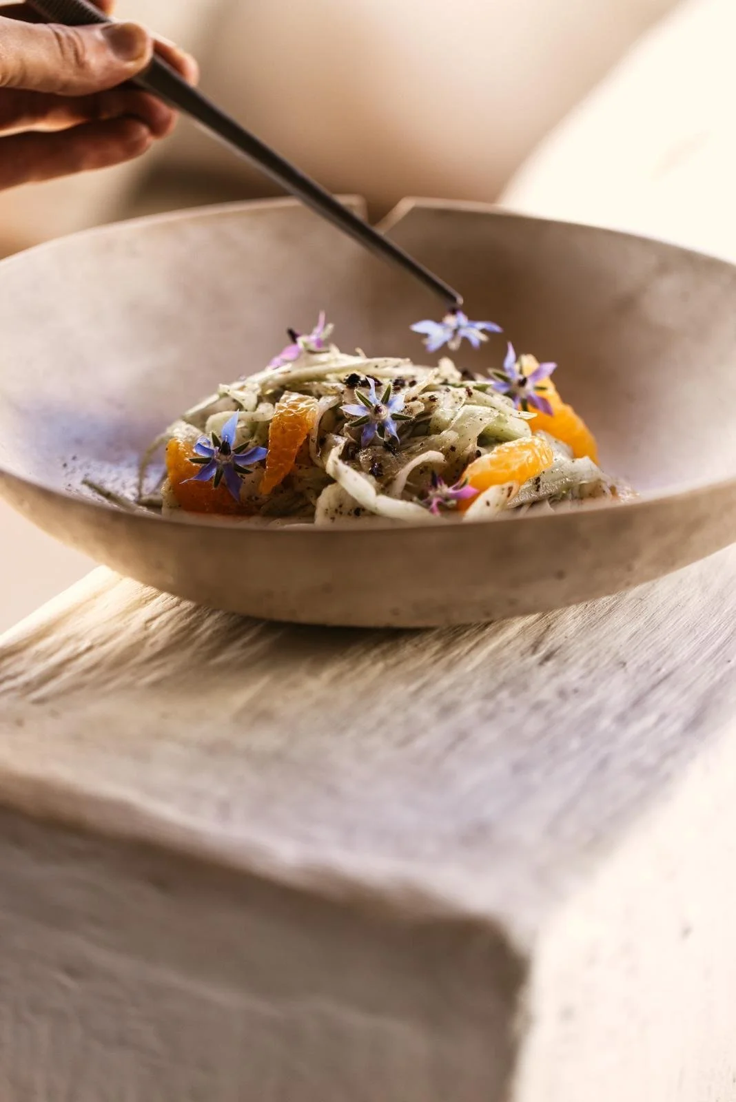 Abstaining from electricity, the kitchen embraces the timeless art of wood-fired cooking, infusing every dish with rich, smoky flavors. The produce is harvested daily from the adjoining permaculture farm, a vibrant haven of fruit trees, vegetables, herbs, and edible flowers. Meals are served on the rustic terrace or indoors, beside a crackling fire.